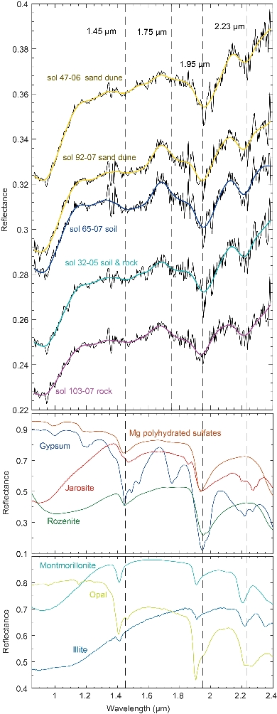 祝融号火星车获得的着陆区所有目标光谱在约1.45和约1.95微米处都显示明显的吸收特征(图3)。这些特征的出现是由于羟基或水分子的存在所致,与激光诱导击穿光谱(LIBS)中观察到的氢信号一致。在排除了定标板固有吸收的本底后,还在2.202.25微米范围内观察到明显的吸收特征。在约1.45微米处的吸收深度约为3%,在约1.95微米处的吸收深度约为10%,在约2.20微米处的吸收深度约为5%,这些值明显高于光谱仪辐射定标的不确定度。除此之外,在约1.20微米和约1.75微米处也存在微弱的吸收。作为对比,由于大气吸收的干扰和轨道探测混合效应及信噪比的限制,这些微弱特征在轨道测量中无法被准确识别。基于祝融号火星车探测到的这些特征,可以推断着陆区存在多种含水矿物,如多水硫酸盐、石膏和含水硅酸盐,其中硫酸盐的含量低于27%-39%(这是一个上限,真实含量可能更低)。