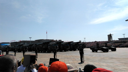 天安门广场成了欢乐的海洋,在纪念大会现场聆听习主席的重要讲话是一生难忘的事,受阅队伍步伐整齐,英姿飒爽,展军姿壮国威,体现中华民族是一个伟大的民族,同时也让我们作为一个中国人感到自豪。在抗战胜利70周年到来之际,组织抗战老兵受阅,让他们在天安门广场上接受来自全世界的掌声和致敬,是对整个抗战老兵群体和无数英烈最宝贵的认可和缅怀。