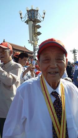 93830分,离退办陪同获奖章的老同志乘坐统一安排的车辆到达天安门广场,一路上看到受阅的队伍在路边整齐待命,心升敬意。老同志佩戴抗战胜利70周年纪念章,精神抖擞,哪像95岁的人呀!