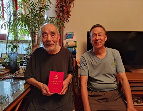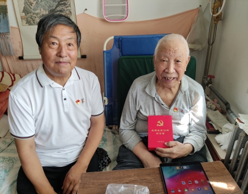 “光荣在党50年”,党的队伍里有你有我。支部书记王哲给每位老党员戴上光荣的徽章,大家一起共咏党的颂歌。
