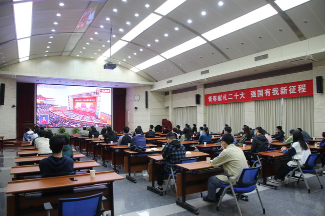2022年10月16日上午10点,中国共产党第二十次全国代表大会在北京人民大会堂隆重开幕。研究所党委高度重视,在做好疫情防控工作的前提下,组织广大职工、研究生根据实际情况观看大会直播盛况。党委书记张小雷及在所师生代表共计60余人一同在地3楼二层报告厅集中收看,各党支部和团支部组织所属党员、团员在线收听收看。