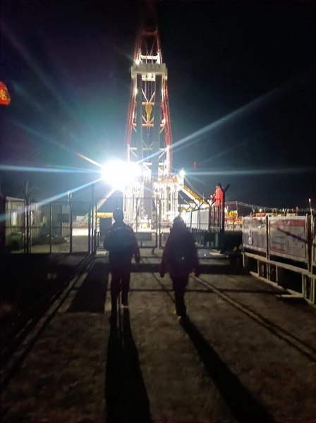 在宾馆待命期间,遇9月18日起库车采取全域静态管理,人员被困无法到井场正常开展试验工作,这将对整个试验计划带来严重影响。得知此紧急情况后,所党委张小雷书记通过中科院新疆分院积极与库车疫情指挥部协调。经过多次沟通获得批准后,10月3日,在当地警车护送下,试验人员身着防护服被点对点运送到井场。在井场工作期间,受到疫情封路影响,钻杆、套管、泥浆材料等生产物资供应不上,导致井队作业多次处于等停状态,极大延长了试验时间。此外,井队食品、生活用品、过冬衣服等生活物资也因无法正常配送出现短缺。试验队员们初到新疆时还是穿着单衣的夏季,所带厚衣服不足,随着进入冬季,夜里最低气温已接近零下10℃,有些试验队员在凌晨工作时被冻感冒了。在井队书记的帮助下,协调到2套旧的棉工衣供夜晚上井试验人员使用。在工作过程中,为了排查从数千米井底发送到地面的压力波信号质量问题,试验队员多次爬上爬下20多米高的钻台检查传感器和连接线。在遇到造斜段频繁掉块卡钻、井下剧烈振动、泵压大幅波动憋停仪器、钻遇缝洞储层发生钻井液严重漏失等复杂工况时,试验队员非常担心井下仪器的安全,夜里不敢合眼守候在控制室工房,随时监控井下的状况,承受着巨大的精神压力与严重睡眠不足的疲惫。通过克服上述困难,团队于10月份完成了高速率随钻测量(MWD)系统和旋转导向2支仪器的试验工作,在井深5085米实现8bps稳定解码;11月份完成了4.75英寸随钻方位电阻率仪器实钻试验工作,试验井深达到6525米,实时获取高质量的随钻测井资料,为探测缝洞型储集层提供了重要数据。