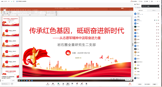 为深化党史学习教育,激励全体党员砥砺奋进,2025年1月21日岩石圈研究生二支部举行了“传承红色基因,砥砺奋进新时代”主题党日活动。本次活动通过腾讯会议线上举办,支部数党员踊跃参与,共同回顾历史、缅怀先烈,汲取奋进力量。