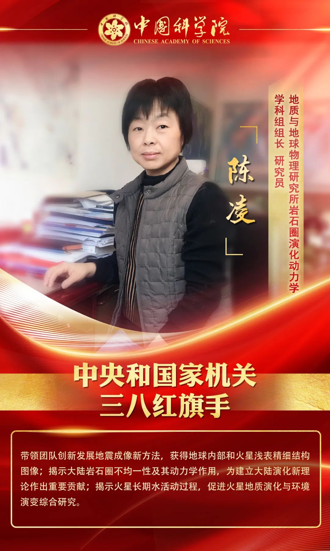 作为我所杰出女性科研工作者的典范,陈凌研究员长期从事固体地球物理学研究,在高精度地震学成像新方法、大陆深部结构与演化动力学研究领域取得了系统性创新成果。陈凌研究员勇于攻关,承担行星科学领域研究方向,她与研究团队共同完成的“火星多时间尺度环境演变”研究成果刷新了人类对火星水活动的认知,被授予2024年度中国科学院杰出科技成就奖(基础研究奖)。