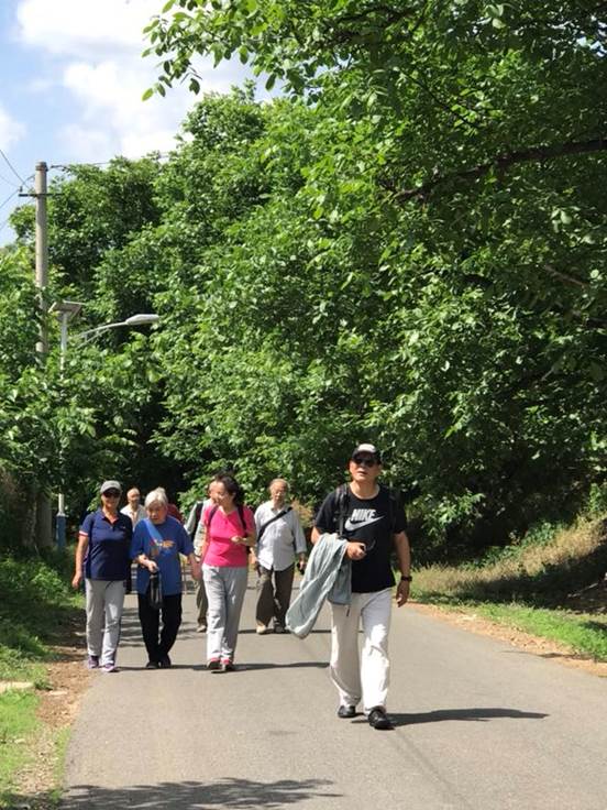 图八 响水湖公园,青山绿水、蓝天白云环境中漫步的老年人