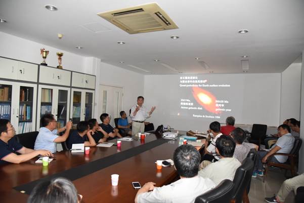 万天丰教授首先介绍了地质学中采用的自然辩证法,明晰了大地构造学的定义和内涵,循序渐进地介绍了魏格纳的大陆漂移说、板块运动、地幔柱以及地幔羽等学说。紧接着系统介绍了早寒武世以来古大陆的再造工作,并详细讨论了中新生代以来板块构造的动力学机制问题。他发现岩石圈表层演化与陨石撞击事件周期性具有相对一致性,进而推测巨大的陨石撞击事件诱发了板块运动。该假说认为,每33±3 Ma,太阳系穿越银道面,使得地球引力场发生突变,易于发生陨石撞击事件;而大型陨石撞击会导致粉尘升空,气候异常,磁极突然翻转,海平面及地理环境发生巨变,生物大量灭绝;进而使得地表质量亏损,由于重力均衡作用使得地幔底辟上升,触发板块张裂并进一步运动。
