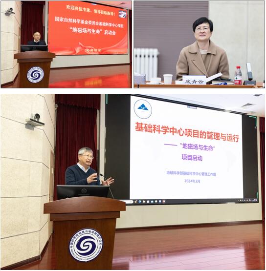 2024年3月1日,国家自然科学基金基础科学中心项目“地磁场与生命”启动会在我所召开。国家自然科学基金委员会地球科学部常务副主任姚玉鹏、副主任张朝林、综合与战略规划处副处长郑袁明、地球物理学和空间物理学项目主任程惠红、综合与战略规划处项目主任李海龙,中国科学院科技促进发展局副局长王强、地球与资源处处长段晓男,项目指导专家组朱日祥院士、李景虹院士、顾宁院士等,我所所长底青云院士、副所长赵亮研究员、科技处处长许晨曦研究员,项目负责人潘永信院士,项目骨干成员赵玉芬院士、魏勇研究员、李建利教授、林巍研究员以及项目组成员等60余位专家出席会议。