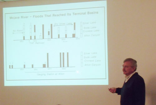 Wells教授首先介绍了Mojave地区湖泊晚第四纪以来的环境演变,结合地貌学、沉积学以及年代学对古湖岸进行了识别、定年,指出Mojave地区湖泊一万年以来至少经历了两次高湖面时期,并定量重建了该区湖泊在高湖面时期的径流及水量,然后又探讨了当时大气环流情况。在第二场报告中,Wells教授介绍了Mojave荒漠中戈壁的形成、发育机制。对于戈壁的形成机制,大多认为是风蚀残留、河流搬运或者土壤收缩膨胀而向上运移砾石的结果。Wells教授通过对戈壁砾石及熔岩进行3He测年,提出了戈壁形成的另外一种模式:表面生成(born on the surface)。之前,多认为戈壁地区风蚀作用占主导。Wells指出,由于砾石对风沙运动的阻挡,戈壁地区存在着显著的风积过程,沉积的沙土将砾石垫高而使其脱离母岩。结果是,地面成为砾石广布的戈壁,而沉积的沙土在砾石下面形成了一层具有微弱土壤发育的加积层。