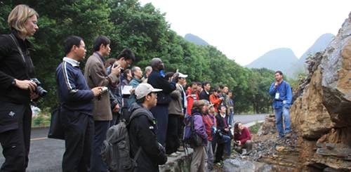 本次会议的主席由我所陈代钊研究员担任,同时他也是该项目的共同主席,来自美国、比利时、捷克、波兰、塞内加尔、印度、越南等国家的19名学者和学生,与来自我所、北京大学、中国地质大学(北京)、合肥工业大学、山东科技大学、中国石油、中国石化等单位的20余名专家以及10余名研究生参加了此次会议。会议通过口头报告和展板的形式,就磁化率在古生界特别是在泥盆系沉积岩的最新研究进展进行了广泛深入的交流。会后,与会代表对广西桂林附近泥盆纪-石炭纪不同沉积环境的地层进行了野外考察,同时项目工作组还进一步对这一地区泥盆纪吉维特期-弗拉斯期和弗拉斯期-法门期以及泥盆纪-石炭系界线地层进行了详细野外工作和系统采样。