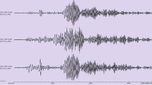 图2,观测到的三分量地震记录(台站CT13,UTC时间:2012:249:15:00-2012:249:16:00)