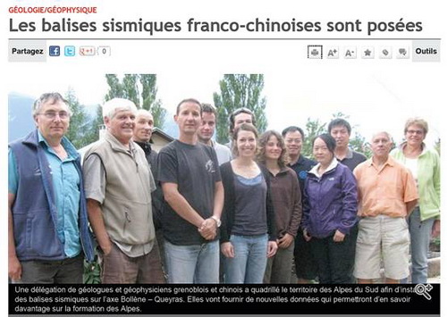法国《道芬自由报(DAUPHINE LIBERE)》对“中法意西阿尔卑斯地震台阵观测”项目进行了跟踪采访,近期以“中法地震台站已成功布设”为题,对流动观测台站在法国境内的布设进展进行了报道(图3,道芬自由报截图)。报道说,“科学家们布设仪器已经获得了法国官方批准。在已经布设的三十多台仪器中,有一半安放在野外或者公共区域,而另一半则放在私人场地。”“这些仪器每台价值约2.5万美元,需要放置在一个非常平的密封基座之上,防止被风或者其它异常波所干扰。……在地面上安装密封箱,然后将记录仪器安置在里边。所有的装置通过棉麻和玻璃纤维与外界隔开。……每台仪器都连接网络、GPS和电源,能够长时间不间断工作。”报道指出,“早在1979年,来自中国科学院的科学家就开始与法国科学家一起合作研究青藏高原。而现在,他们开始关注阿尔卑斯,试图寻找二者之间的联系。”这些台站将为研究阿尔卑斯山的形成提供更新更精确的数据。