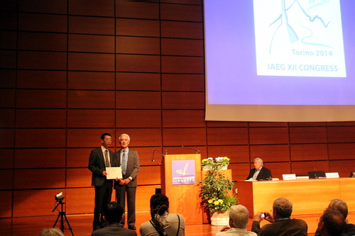 在本次大会上,法国巴黎高等矿业学校Roger Cojean教授获得了IAEG终身成就奖(Hans Cloos Medal);英国布里斯托大学Brian Hawkins教授获得了IAEG杰出贡献奖(Marcel Arnould Medal);新加坡南洋理工大学Louis N.Y. Wong博士、我所祁生文博士以及希腊亚里斯多德大学Vassilis Marinos博士三人获得IAEG青年奖(Richard Wolters Prize)IAEG设立终身成就奖Hans Cloos Medal (HCM)和青年奖Richard Wolters Prize (RWP),每两年1次。为提高青年奖的竞争性,2010年开始,青年奖改为由每个国家委员会提名、有效候选人现场答辩、评审团科学家投票的方式产生。