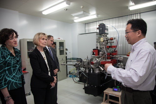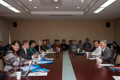 朱日祥所长代表研究所致欢迎词并就我所的历史沿袭、总体概况、实验设备及近期开展的科研项目等向外宾进行了介绍。AGU总裁Margret Leinen 就AGU在全球的影响力,AGU会议种类,AGU科学期刊等方面对学会进行了介绍。她强调参加AGU会议的中国会员数量近几年呈上升趋势;AGU科学期刊第一作者投稿全球占比中国为14%,仅次于美国和欧洲;从作者单位看,和国内其他同行比较,中科院发表文章数量占比为54%,远超国内其他相关机构。与会的科研人员和研究生就关心的问题和外宾展开了热烈的讨论。最后双方达成一致意见,并由挂靠在研究所的中国地球物理学会(CGS)与AGU签署了合作备忘录。会议结束后,AGU代表团在朱日祥所长的陪同下参观了纳米离子探针实验室、离子探针实验室和多接收等离子体质谱仪实验室。