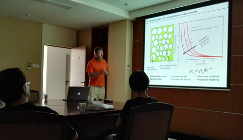报告持续了近两个小时,与会者就大地电磁方法对地壳电阻率异常体成像,安第斯中、南部地区地壳低阻体地质解释,火山区岩浆成分及形成机制等问题与Unsworth教授进行了热烈讨论。