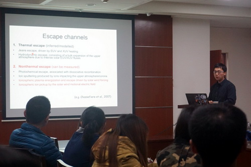 交流会上,王晓栋作了题为“火星快车/ASPERA-3对火星大气逃逸过程的观测”的学术报告。报告中,王晓栋对瑞典空间物理所的概况作了简要介绍,回顾了近些年来火星大气粒子逃逸的工作进展,并重点介绍了他们研究小组最新的研究成果。报告现场气氛热烈,听众们积极提问,并与王晓栋进行了讨论交流。