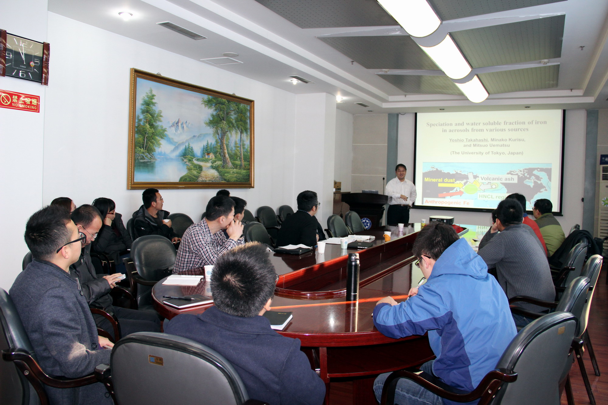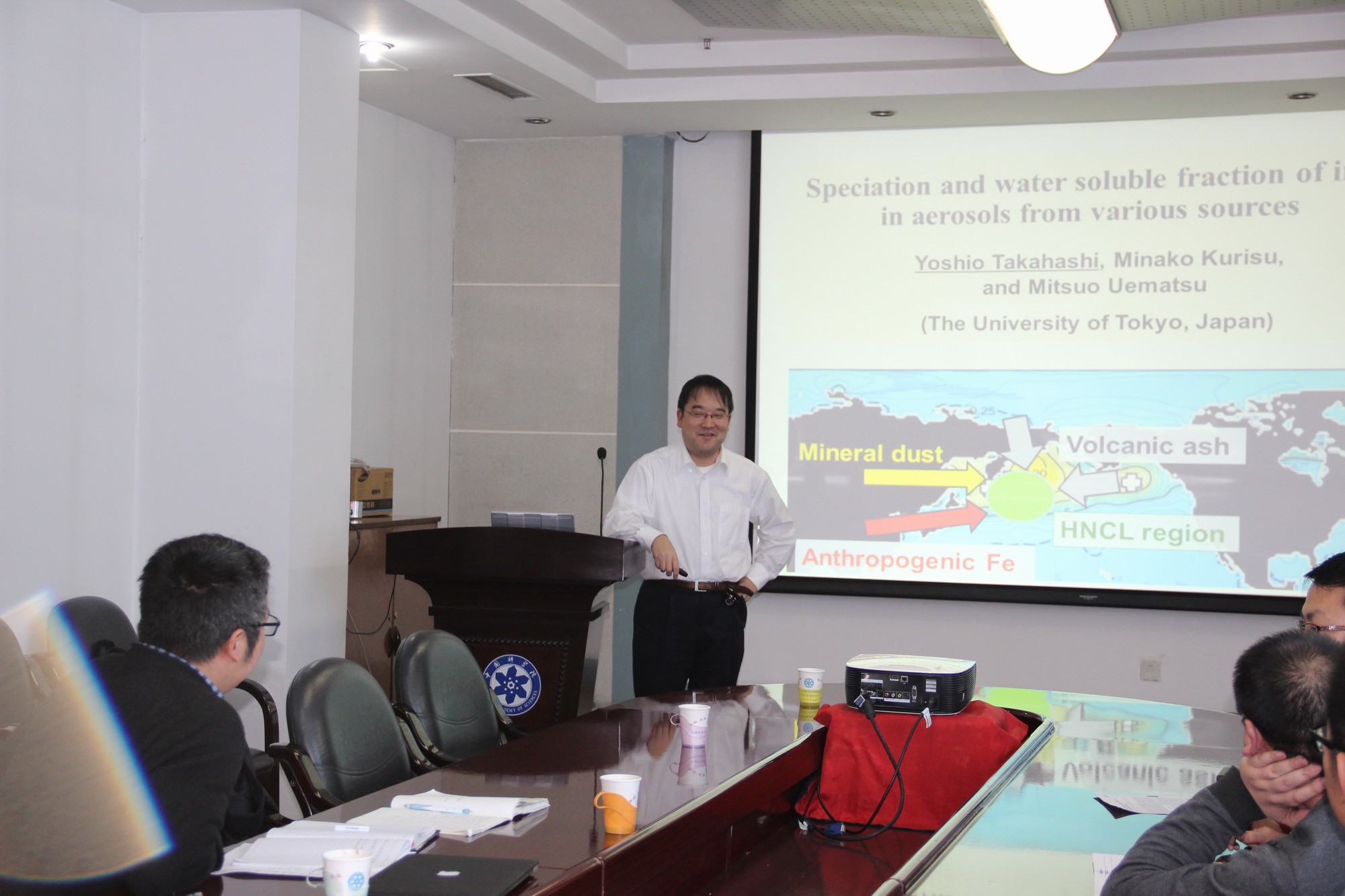 1228日上午,Yoshio Takahashi教授在中心二楼会议室作了题为Speciation and isotopic analysis of iron in aerosols related to climate change research的学术报告。Yoshio Takahashi教授主要介绍了运用铁的形态变化铁的生物利用性和铁同位素指标等探讨气溶胶中铁的来源及其对全球环境变化的可能贡献。Takahashi教授首先介绍X-射线精细结构(XAFS)的分析原理,并运用该技术研究了新疆阿克苏、青岛和筑波气溶胶样品中铁的形态,表明在气溶胶长距离传输过程中可能受人为活动的影响,铁能转变成为生物利用性更高水合铁氧化物。随后通过对不同粒级气溶胶中铁同位素的分析,探讨了铁同位素可以很好反映人为活动的贡献。