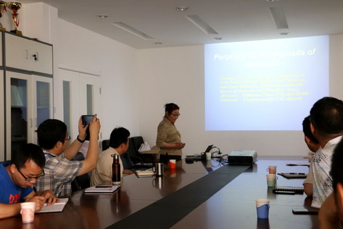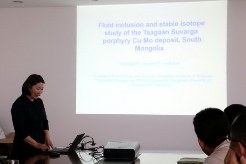 6月21日Orolmaa和Tungalag教授在我所地6楼4层会议室分别作了题为“Porphyry Cu-Mo deposits of Mongolia”和“Fluid inclution and stable isotope study of the Tsagaan Suvraga porphyry Cu-Mo deposit, South Mongolia”的学术报告。