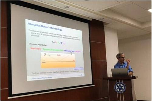 在题为“Q: What is it good for”的报告中,M. E. Pasyanos研究员展示了地震波衰减机制研究的最新成果,主要包括区域震相的衰减特征、量化和应用,例如,联合反演、地温预测、震级测定、强地面运动模拟和台站覆盖能力考察等。第二个报告题目是“The coupled location/depth/yield problem for North Korea's declared nuclear tests”。M. E. Pasyanos研究员利用区域地震波衰减模型计算了区域震相及尾波的理论波形包络,通过拟合实际观测数据,同时得到了六次朝鲜核试验的埋深与爆炸当量。第三个报告的题目是“LITHO 1.0”。根据0.2-25s周期的面波频散曲线,M. E. Pasyanos研究员获得了全球尺度的岩石圈结构模型,包括地壳速度、厚度、上地幔速度和岩石圈厚度等。该模型可作为研究地球浅部精细结构的初始模型,已经被广泛地应用于走时层析成像等地球物理研究中。