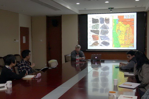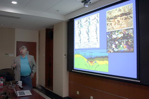Henry Dick教授在访问期间开设《Petrotectonic of Ocean Ridges》短期课程,介绍并详细论述了大洋岩石圈形成和演化方面基础的知识和最新的认识与进展,极大地促进了我所师生对海洋地质学的认识和兴趣。Henry Dick教授开设的课程内容主要涵盖了洋中脊玄武岩(MORB)的成因、洋壳的增生与演化、地幔部分熔融和熔体流动、莫霍面成因、超慢速扩张脊的定义及特征、大洋下地壳和地幔中的熔岩反应过程。课程详细地介绍了洋中脊玄武岩的成因、组成及控制其组成和地幔熔融过程的因素等基础知识;并以西南印度洋脊的Atlantis Bank地区的研究为例详细阐述了慢速-超慢速扩张环境下的下洋壳结构及其复杂的增生和熔体迁移过程以及蛇纹石化前缘作为地震学莫霍面的新认识;通过介绍西南印度洋脊的玄武岩、深海橄榄岩研究工作,论述了西南印度洋脊的Marion Rise之下存在冈瓦纳大陆裂解残余的古老难熔地幔,并提出通过低密度难熔地幔区域的存在可以产生洋底的高地形,表明洋底高地形的产生并非需要借助热点;通过对近期大洋下地壳熔岩反应的研究向大家介绍了下洋壳岩性分异近期的新认识,即通过不同阶段的熔岩反应过程也可以产生与结晶分异过程类似的下洋壳岩性分异;通过介绍和分析北冰洋Gakkel洋脊和西南印度洋脊的地质特征,为大家介绍了超慢速扩张脊的定义和特征。各个课程结束后,Henry Dick教授也和在场师生进行了热烈的讨论和交流。