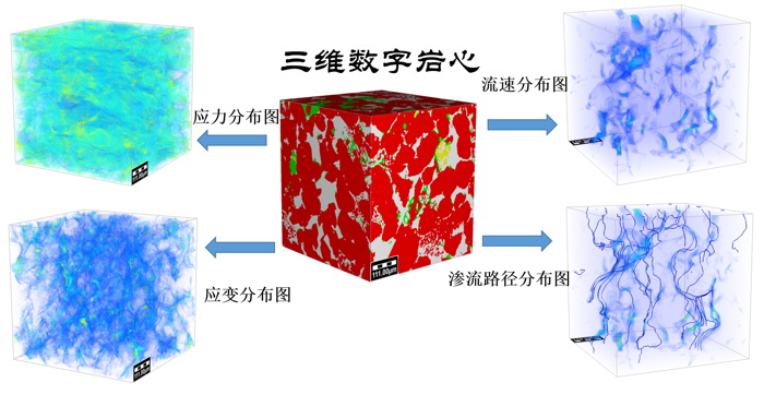 数字岩石物理的基本原理是“成像+计算”(下图)。先利用先进成像设备(如微米CT、聚焦离子束-扫描电镜等)获得岩石样品矿物基质和孔隙的高分辨三维结构(可称数字岩心),经过图像处理,然后在数字岩心上模拟计算岩石的应力-应变、孔隙内流体输运等过程,获得岩石流体传输(如渗透率等)、力学(如弹性模量、泊松比等)、 电学等性质(下图)。