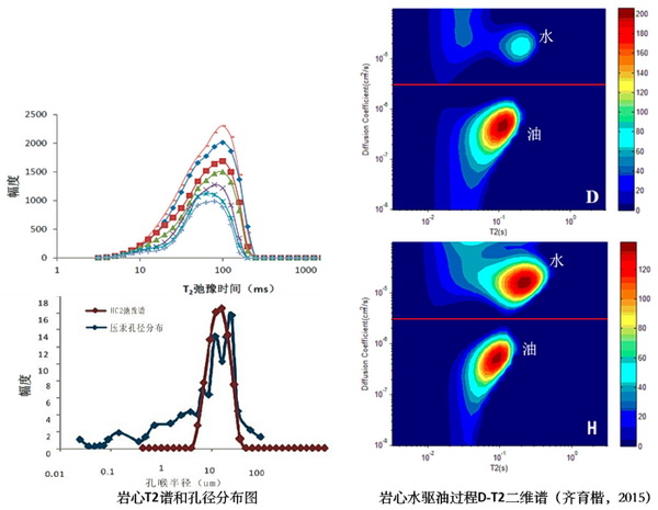 核磁共振(NMR) 技术利用T2弛豫时间谱能够快速、无损地测得多项岩心物性参数,正在成为储层物性表征的常规测试手段, 已经被广泛应用于石油领域。将流体的扩散系数信息与T2弛豫时间谱相结合,引入了核磁共振扩散-弛豫二维谱,同时对孔隙中油和水的微观分布状态进行描述,能够完成对岩心的T2弛豫时间、扩散弛豫二维谱的测试以及进行核磁共振成像。