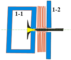 图1 传统离子源电离室结构,其中1-1是电离室,1-2为引出透镜;图中红色为电势分布线,黑色为离子轨迹,黄色为可通过离子的轨迹 为提高离子引出效率,中科院800彩票支撑系统张建超工程师发明了一种新型电子轰击离子源的试验装置及其设计方法,并于近期获得国家专利授权(发明名称:一种新型电子轰击离子源的试验装置及其设计方法;发明人:张建超;专利号:ZL 2015 1 0084977.0)。 该发明创新性的提出,在电离室空间内引入四极场,改善电离室的空间分布,进而提高离子源的离子引出效率(图2)。同时,发明人还在离子源的结构上进行改进,既保证了样品气体的密度,同时还能保证仪器的记忆效应。此外,通过改善灯丝发射系统以进一步提高离子产率。以上三个方面的综合改进有效的提高了质谱仪器的灵敏度。该离子源可用于惰性气体质谱,气体同位素质谱等磁式质谱,也可以用于四级杆质谱和飞行时间质谱。