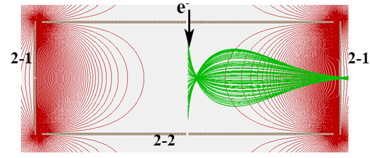 图2 新型离子源电离室内的电势分布及离子轨迹,其中2-1为端盖电极,2-2为中间筒状电极;图中红线为电势分布曲线,而绿色为离子运行轨迹 |