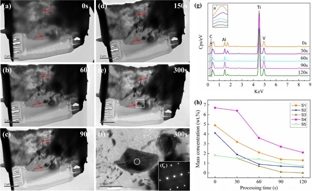 图3 (a-f)PGE矿物在等离子体清洗前、后的TEM明场像;(g-h)Ti合金试样在等离子体清洗前、后的TEM-EDS谱图以及碳浓度随清洗时间的函数