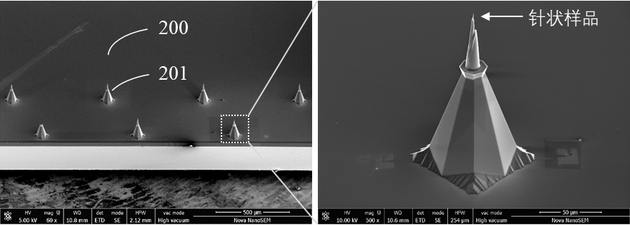 图4 硅片及硅柱上针状样品的扫描电镜图像