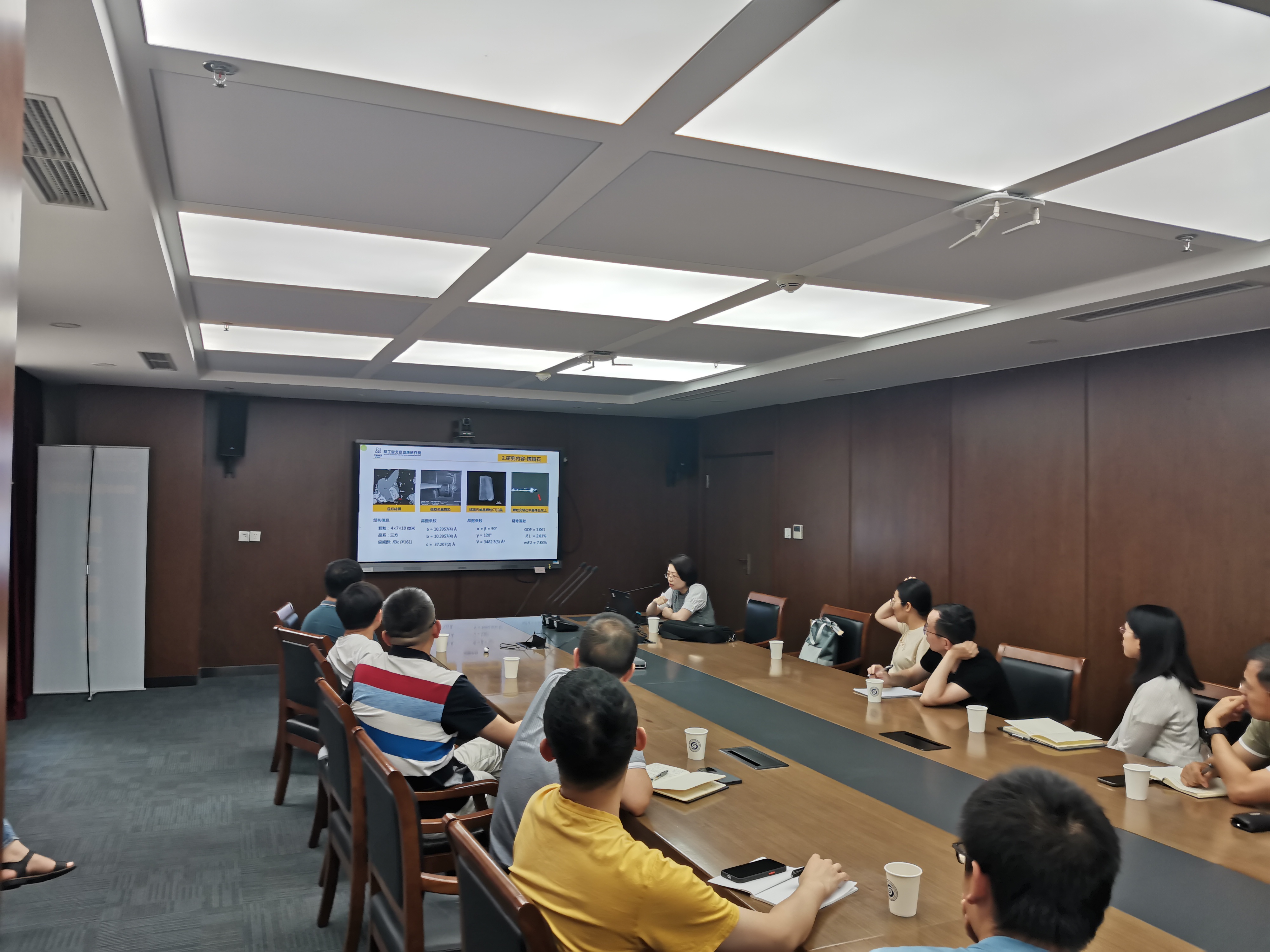 李婷正高级工程师作了题为“新矿物的发现意义与研究方法”的报告,详细介绍了地质与行星样品中新矿物发现和研究的关键技术,尤其是微米级矿物(如嫦娥石)的研究,并讨论了新矿物的发现对其他科学问题和关键矿产的指示意义。陈永金副研究员作了题为“透射电镜在锂电池材料微结构研究中的应用”,深入浅出的讲述了目前锂电池微结构研究的现状和前沿进展,并介绍了使用球差透射电镜分析位错、晶体结构和元素价态的经验。与会人员就报告的具体内容进行了热烈讨论,取得了良好交流效果。