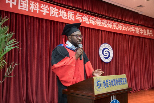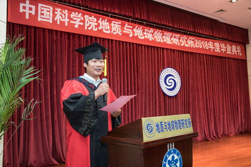 2018届博士毕业生张瑞龙和留学生CYRIL BOATENG代表全体毕业生分别作了热情洋溢的发言,回顾了在研究所学习、生活的难忘经历,也表达了对研究所、导师、同学、亲友的感恩之情,并勉励全体毕业生要继续努力、不断前行。