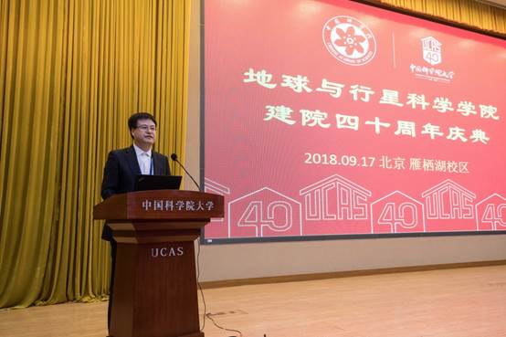 国科大常务副书记董军社高度赞扬了地学院四十年取得的辉煌成绩,感谢在座各位老师、校友的辛勤付出。伴随着中国改革开放四十年的快速发展和国科大的不断创新,地学院从年轻走向成熟,已然成为我国地球科学人才的重要培养基地。