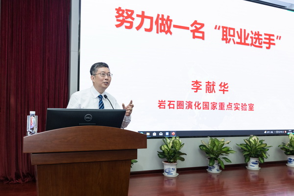 李献华院士为新生讲授精彩的“开学第一课”。他以《努力做一名”职业选手”》为题,分享了自己求学和工作的经历,并讲述了他带领团队用7天完成嫦娥五号样品分析测试、用16天完成论文撰写投稿、用100天在《Nature》上同时发表三篇文章,跑出了月壤研究的“中国速度”的精彩故事。他结合自身成长经历,勉励同学们,做好科研工作,不仅需要聪明的头脑和勤奋的努力,同时还需要长期的坚持,更需要看到自己的不足,最终才能够成长为一名“职业选手”。最后他祝愿全体新生学业有成!