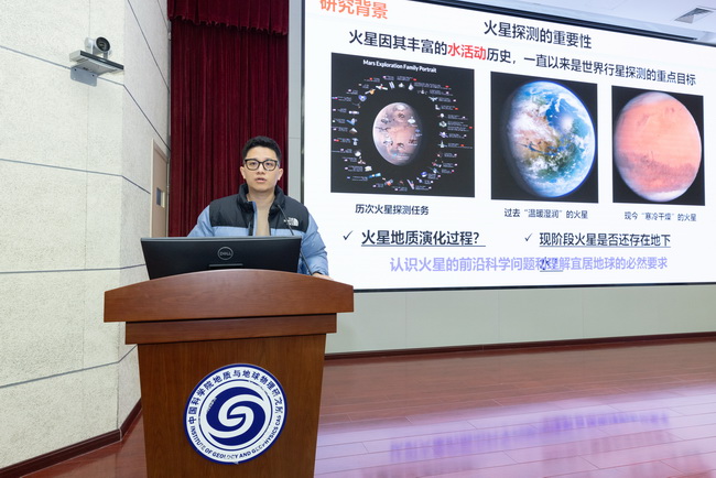 本次学术年会邀请研究所博士后李超作题为“祝融号着陆浅表层精细结构及古环境演化”的特邀报告,介绍了利用祝融号火星车次表层探测雷达揭示的着陆区精细结构,发现着陆区发生了多期次水活动相关的火表改造事件及掩埋在地下的古多边形地貌这一成果。