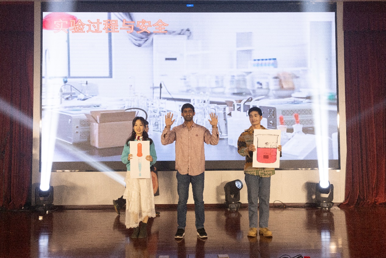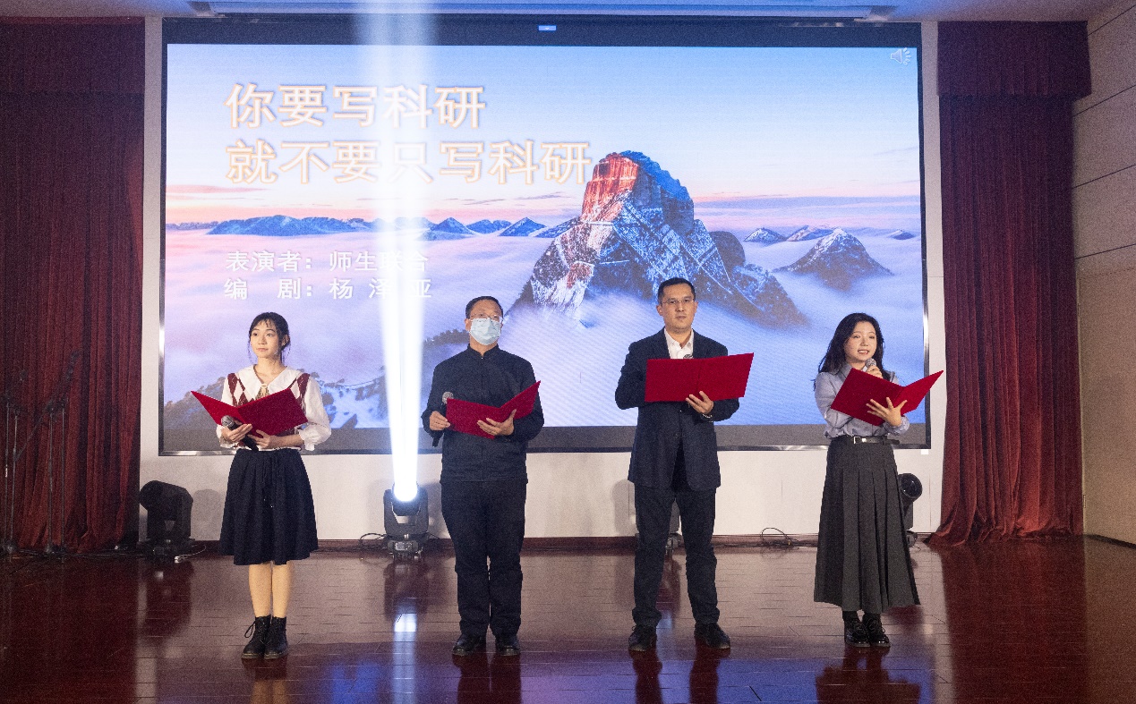随着聚光灯亮起,开场舞《桃花朵朵开》拉开了联欢会序幕,青春活力的舞姿与韵律,彰显青年朝气,迅速点燃全场气氛。古典舞《纸扇书生》以优雅的身姿、精致的扇舞,演绎了一段书生的风雅情怀,展现了科研工作者的人文情怀与文化底蕴。师生联合朗诵《你要写科研 就不要只写科研》更是将现场气氛推向高潮,黄向阳、赵亮与两位同学共同用深情的话语诉说着地学研究的梦想与坚持,激发了大家科技报国的热情。歌曲类节目《多远都要在一起》、《手心的太阳》、《科研阵线联盟》、《上春山》、《Last Night & First Day》等风格多样,或温情、或诙谐、或活力四射,赢得台下观众的阵阵欢呼。情景剧《科研好帮手》展现了科研探索过程的快乐与艰辛,同时借助喜剧的形式勉励大家做好科研需要脚踏实地。