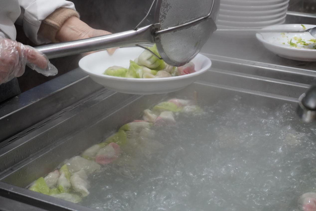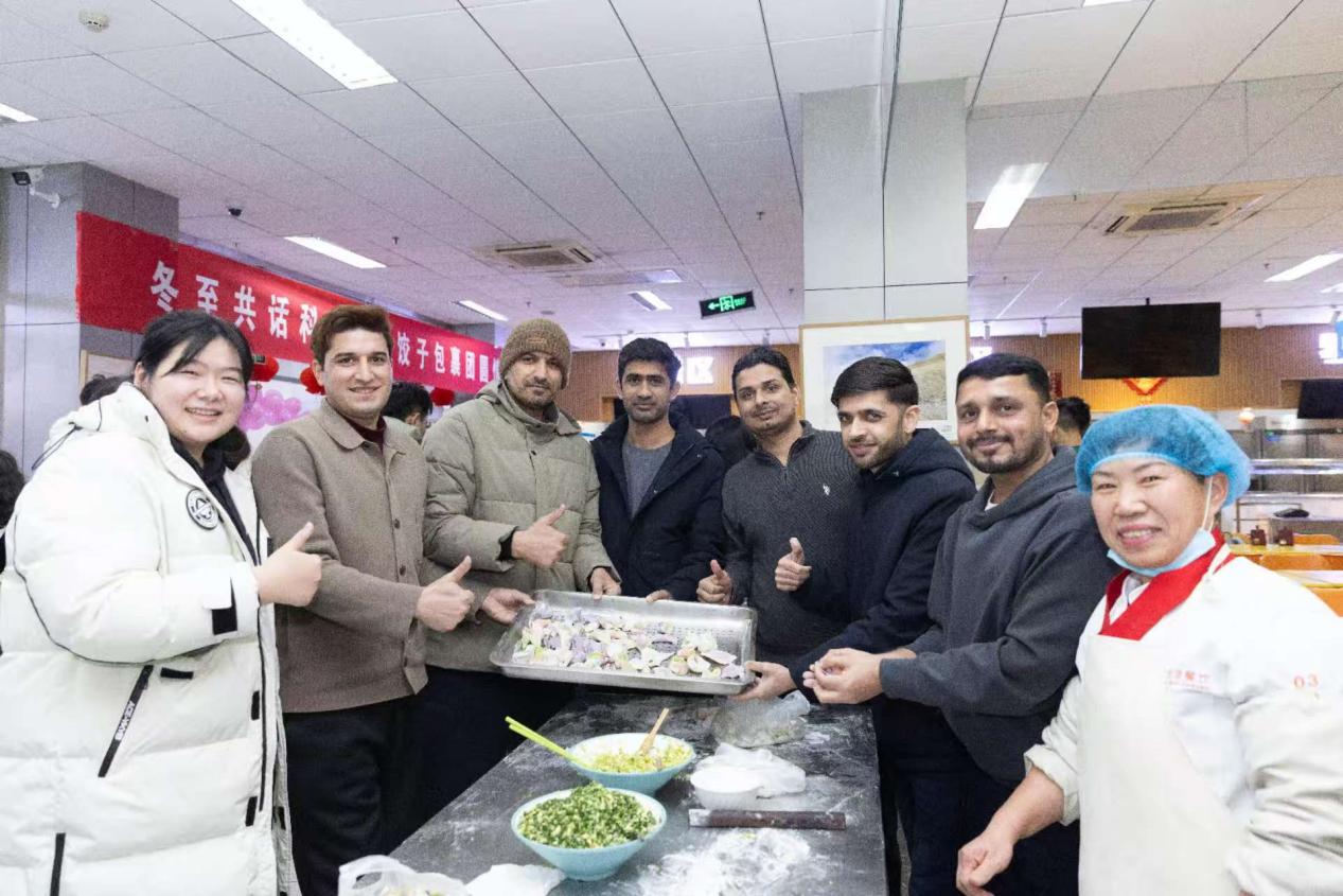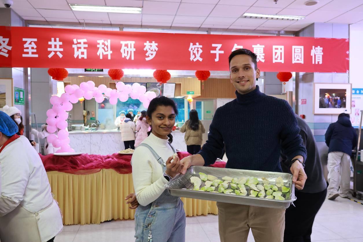 为帮助初次尝试的同学快速上手,食堂师傅现场示范擀皮、包馅的技巧。现场既有“老手”大显身手,捏、挤、捏的动作行云流水,饱满圆润的饺子整齐列队;也有“新手”虚心求教,在身旁同学的耐心指导下,从擀皮歪斜到包馅匀称,逐步掌握诀窍,虽造型各异却充满心意。大家一边专注于手中的饺子,一边畅谈着自己家乡的冬至习俗和趣事、科研中的点滴感悟等等,现场气氛温馨融洽,欢声笑语接连不断、此起彼伏。当一盘盘满载心意的饺子摆满盘子,工作人员即刻接力送入锅中,新鲜的饺子入锅翻滚,升腾的热气将现场的温馨氛围推向高潮。
