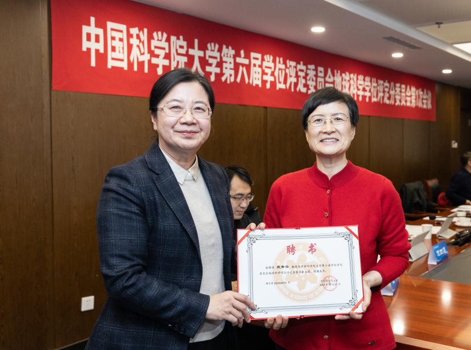 2023年12月30日,中国科学院大学第六届学位评定委员会地球科学学位评定分委员会第一次会议在我所召开。中国科学院大学党委常务副书记、副校长王艳芬为委员会主席底青云颁发聘书。