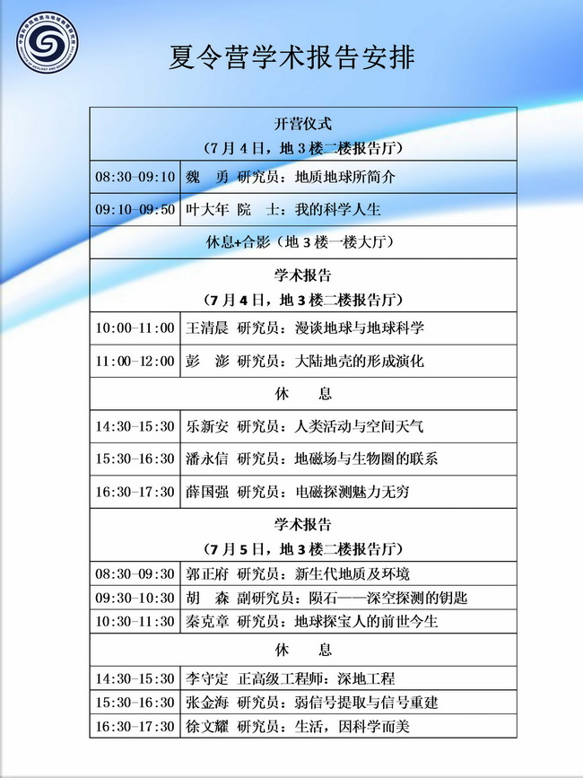 【7.3-7.7】第四届地球与行星科学大学生夏令营日程及学术报告安排