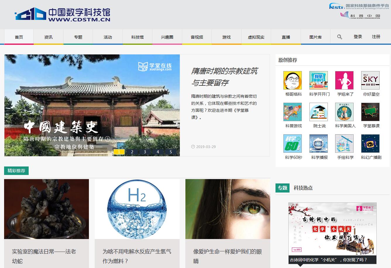 中国数字科技馆是中国科协牵头、由、教育部、中国科学院共同建设的一个基于互联网传播的国家级最大的公益性科普服务平台。中国数字科技馆以激发公众科学兴趣、提高公众科学素质为已任,面向全体公众,特别是青少年群体,搭建一个网络科普园地。在中国数字科技馆这个平台上,公众能够增长科学知识,体验科学过程,激发创意灵感,了解科技动态,分享丰富的科普资源。