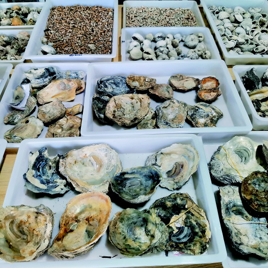 在这样的环境下,先民们显然先得靠海吃海。在基坑里,记者看到土层里夹杂着一层层的贝壳。在考古工地工作用房门外的走廊上,一排排装满各类贝壳的塑料箱摞了两三层高。而在两大间库房里,各种海生贝类的贝壳摆了“好几桌”,特别是那些巨大的牡蛎壳,大的足足有餐桌上的菜盆子那么大,由此想象一下,足以让现代的老饕们垂涎三尺。
