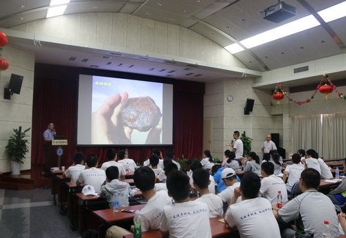 我所高度重视此次活动,杨进辉副所长首先代表研究所致欢迎辞,希望同学们通过此次活动,对我所有更深入的了解,对地球科学产生浓厚的兴趣,将来有兴趣可以从事地球科学研究工作。随后,从事陨石和月球、火星形成演化历史研究的年轻科研人员胡森副研究员作了题为“陨石的研究意义及鉴定方法”的科普讲座,他以陨石的发现和收集、陨石的研究意义以及陨石的鉴定方法为主线路进行了科普讲解,并配以自己携带的陨石标本,让同学们边听边观察。首次近距离、亲手触摸和观察陨石标本的师生们表示了极大的兴趣,并在报告结束之后进行了热烈的互动交流。