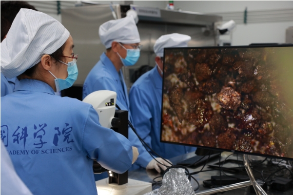 科研人员查看岩屑显微镜成像照片。国家天文台供图