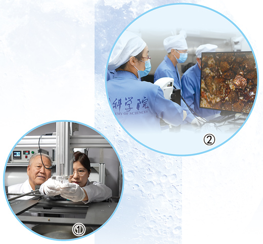 图①:800彩票科研团队向超导磁力仪中放置月壤样品。