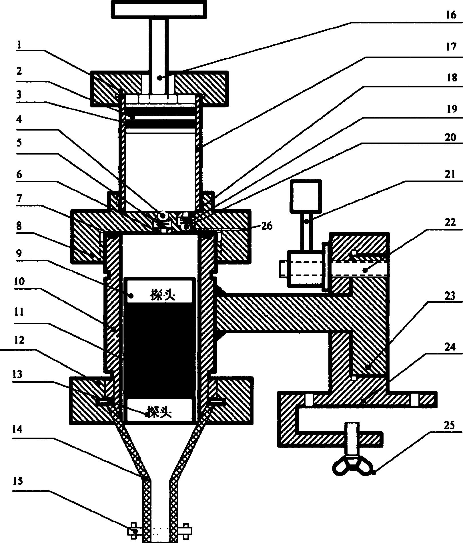 一种气压式样品装样器:一气压室,内部装有活塞块,该活塞块上方连接一活塞杆,由活塞杆带动活塞块在气压室内做向下和向上的往复运动;该气压室的下端连接第一固定压帽,该第一固定压帽的下方连接储物室;第一固定压帽设有第一锥度槽和第二锥度槽,其中第一个锥度槽贯通气压室和储物室,所述第一锥度槽的锥度口朝向气压室;第二锥度槽连接一气道,所述第二锥度槽的锥度口朝向储物室;第一锥度槽和第二锥度槽内均设有一弹簧,其中第一锥度槽内的弹簧上方抵顶一钢珠,形成由气压室至储物室的单向气阀;第二锥度槽内的弹簧下方抵顶一钢珠,形成气压室至大气的单向气阀;储物室的下端口设有第二固定压帽,该第二固定压帽与储物室之间夹持一橡皮套。 |