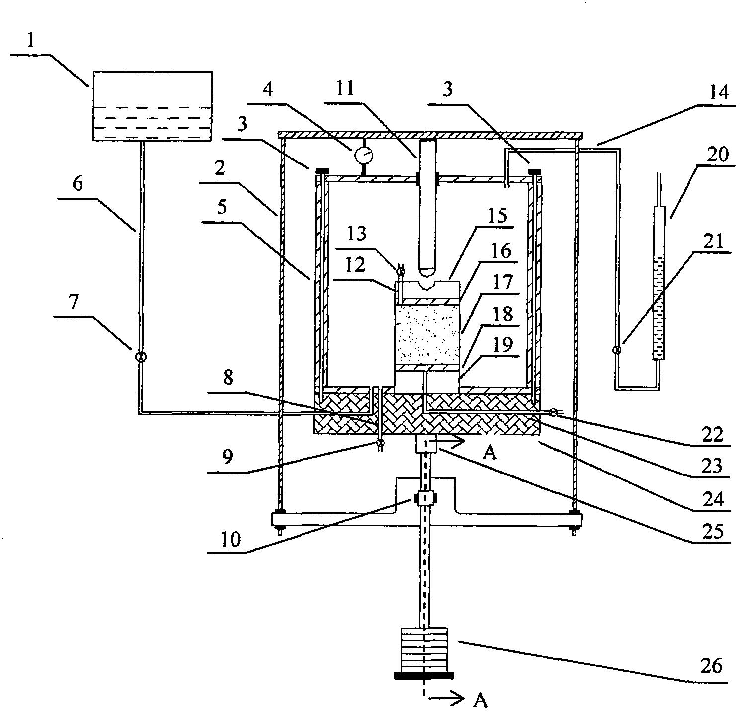 一种饱和非饱和岩土体单轴压缩蠕变试验方法,其特征在于利用一种装置进行岩土体的单轴压缩蠕变的测试,该装置主要包括水箱(1),加压框架(2),千分表(4),压力室(5),进水管(6),排水管(8),加压轴(11),上排水管(12),导水管(14),顶帽(15),上透水石(16),下透水石(18),底座(19),量水管(20),下排水管(23),压力室底座(24),固定栓(25),砝码(26),加压杠杆(30)等。该仪器制造简单,测量精度高,可以直接测定各种软岩、硬土在饱和或非饱和条件下的长期蠕变抗压强度与变形参数。可用于土木工程中遇到的各种软岩、硬土的室内或现场测试。测试方法主要分为安装试样、充水准备与试样加载三步。 |