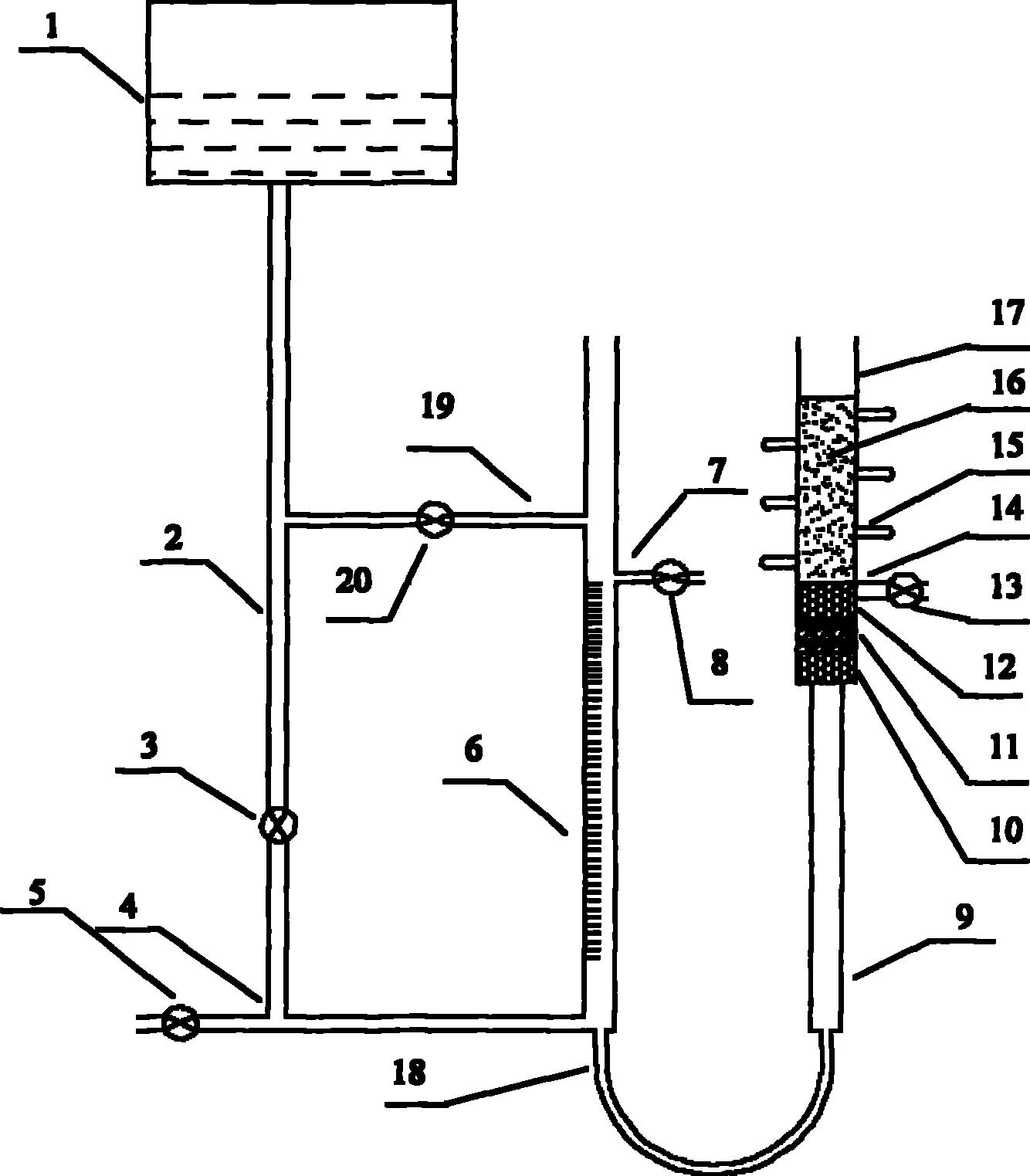 一种多孔介质毛细水上升高度的试验方法,其特征是利用一种试验装置量测毛细水上升高度。该装置各部件关联如下:水箱(1)通过下水管(2)与测压管(6)连接,测压管(6)通过塑料管(18)与毛细管(9)连接,下水管(2)通过补水管(19)与测压管(6)连接,补水管(19)通过补水管开关(20)控制,测压管(6)连接有溢水管(7),下透水石(10)上面铺有粗砂(11),粗砂(11)上面安装有上透水石(12),上透水石(12)表面铺有滤纸,滤纸上面装有试样(16),试样筒(17)连接排气管(14),试样筒(17)安装有多个取土孔塞(15)。该测量方法所用仪器制造简单,测量精度高,使用方便,满足样品毛细水上升高度控制要求,可以直接测定各种多孔介质包括砂、砂土、粉土的毛细水上升高度与速率等参数,可用于土木工程中遇到的各种多孔介质毛细水上升高度与速率等参数的室内或现场测试。 |