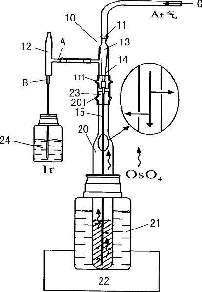 4蒸汽在Ar气的载带下通过专用接口进入雾化器的载气口,雾化器的进液口引入Ir溶液,雾化器的喷嘴处形成含Os和Ir的混合气溶胶。本发明与公知技术不同之处,是用Ar气载带着Os蒸汽进入雾化器载气口后到达矩管,本发明从进液管引入的Ir标准溶液用于在线质量歧视校正,测量精度得到改善;Carius管溶样后,无需分离,可直接原位蒸馏并同时在线精确测定Os同位素比值及含量。本发明与原有在线测定方法相比不易灭火,与溶液进样测定方法相比记忆效应明显减小。