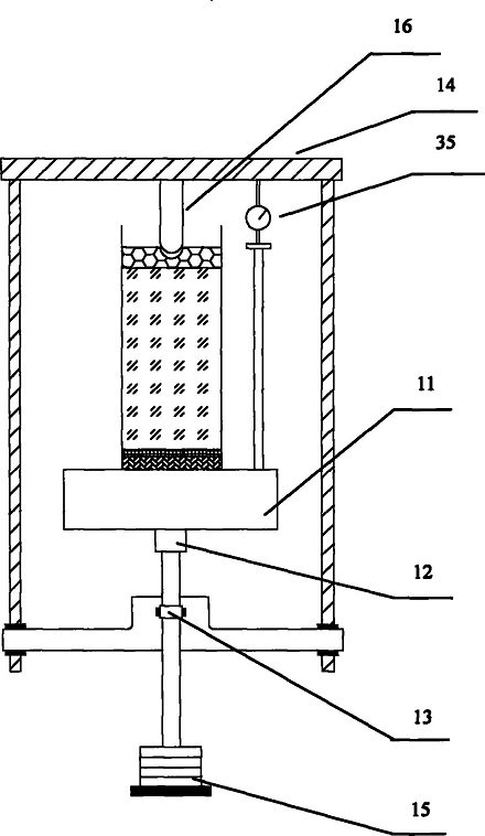 一种非饱和土体定水头垂直渗透量测装置,其特征是该装置包括瓶塞(1),集水瓶(2),第一排气口(3),第二排气口(4),第三排气口(5),第一阀门(6),第二阀门(7),第三阀门(8),第四阀门(9),第五阀门(10),水箱(11),固定栓(12),转动轴(13),加压框架(14),砝码(15),加压轴(16),第一渗流管(17),第二渗流管(18),顶帽(19),渗流桶(20),透水石(21),下底座(22),第一取样口(23),第二取样口(24),第三取样口(25),第六阀门(26),第七阀门(27),第八阀门(28),第一监测口(29),第二监测口(30),第三监测口(31),第九阀门(32),第十阀门(33),第十一阀门(34),位移计(35),连通管(36)和试样(37)。该装置测量精度高,使用方便,满足样品加载条件下定水头垂直渗透控制要求,可以直接测定砂土、粉土、粘土等多孔介质的渗透特性参数。