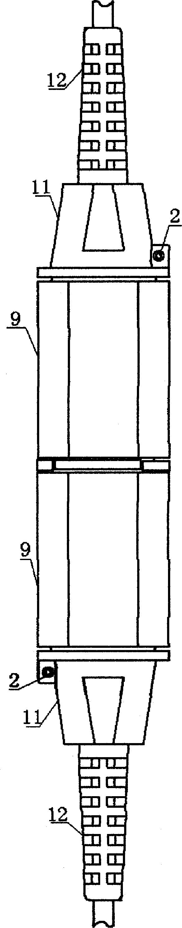 本发明涉及一种电缆快换接头,为解决现有接头防水性差问题,其包括自体互插形插头和插头配用的护盖,所述插头包括后端封装电缆及电缆端护套、前端通过丝扣和定位螺钉固装主体的尾帽,所述主体前端中心有插接芯头,主体在其插接芯头外周制有向前伸出的相对分布的一对四分之一弧形外罗纹槽卡头,外罗纹槽卡头与尾帽之间套装有前端内周制有与对接插头主体的外罗纹槽卡头相配合的一对四分之一弧形内螺纹牙卡扣的锁紧把手;护盖前面中心固装有用于密封对接所述插接芯头的弹性堵头,护盖制有自弹性堵头外周向前伸出与插头锁紧把手的内螺纹牙卡扣相配合的一对四分之一弧形外罗纹槽卡头,护盖通过固定索与插头尾帽相连。其具有快速自锁连接性能优越,能经受轴向拉力和径向剪力,不松动、不变形,接插速度快,防水性能好,使用非常方便的优点。