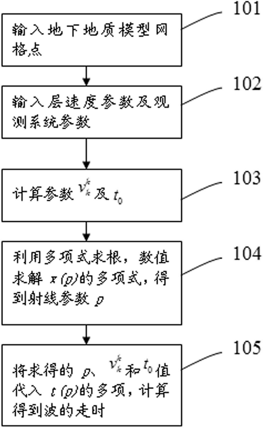 0的值代入地震波传播时间t(p)的多项式,计算得到地震波的走时。本发明的VTI介质中地震波的走时计算方法,其计算精度高,并且计算量相对较小,可以快速地计算得出结果。由于走时与射线参数相关,可以控制射线的方向,能够满足目前的例如油气资源探测等地质探测工程需要。
